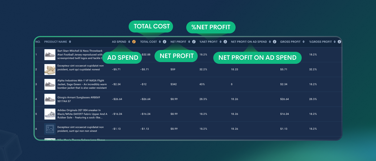 • Net Profit on Ad Spend: The ratio between your Net Profit and Ad Spend, so that you know how profitable your ads are. Formula: Net Profit on Ad spend = Net Profit / Ad Spend